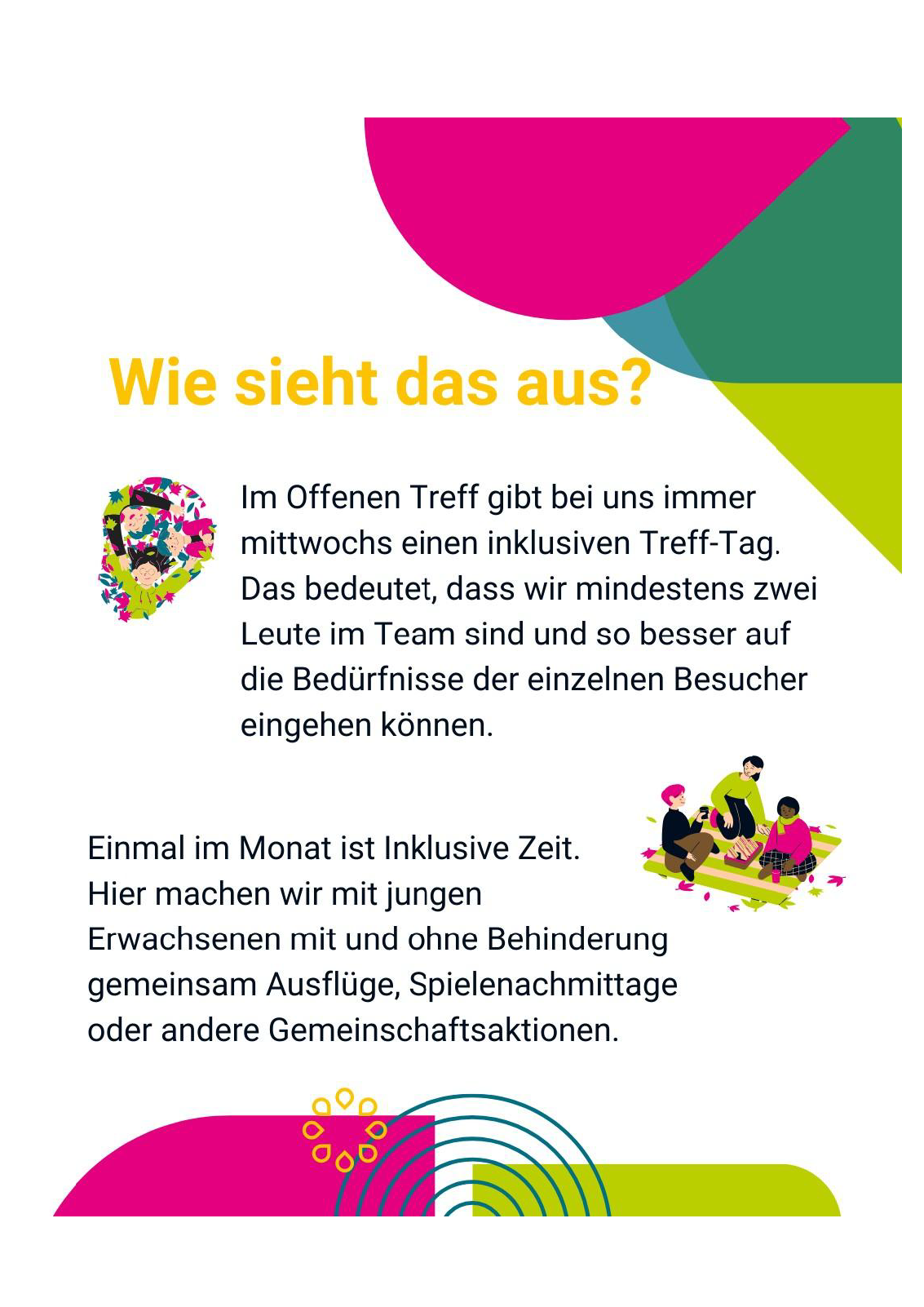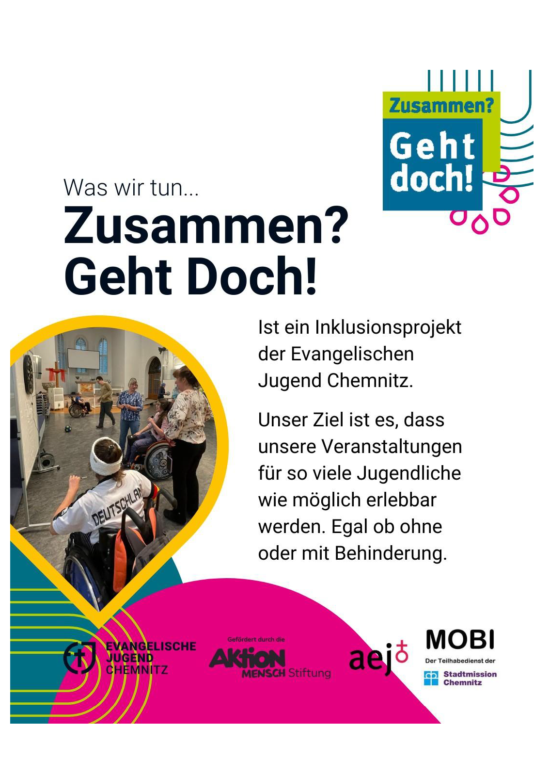 Ein wesentliches Ziel des Modellprojektes ist die praktische Erprobung einer engen Zusammenarbeit von Mitarbeiter*innen der evangelischen Kinder- und Jugendarbeit und Einrichtungen der Behindertenhilfe. Im Zusammenwirken sollen Angebote verändert oder neue geschaffen werden, die die Teilhabe und Teilnahme von Kindern und Jugendlichen im Alter von ca. 8 bis 21 Jahren mit und ohne Behinderungen ermöglicht.